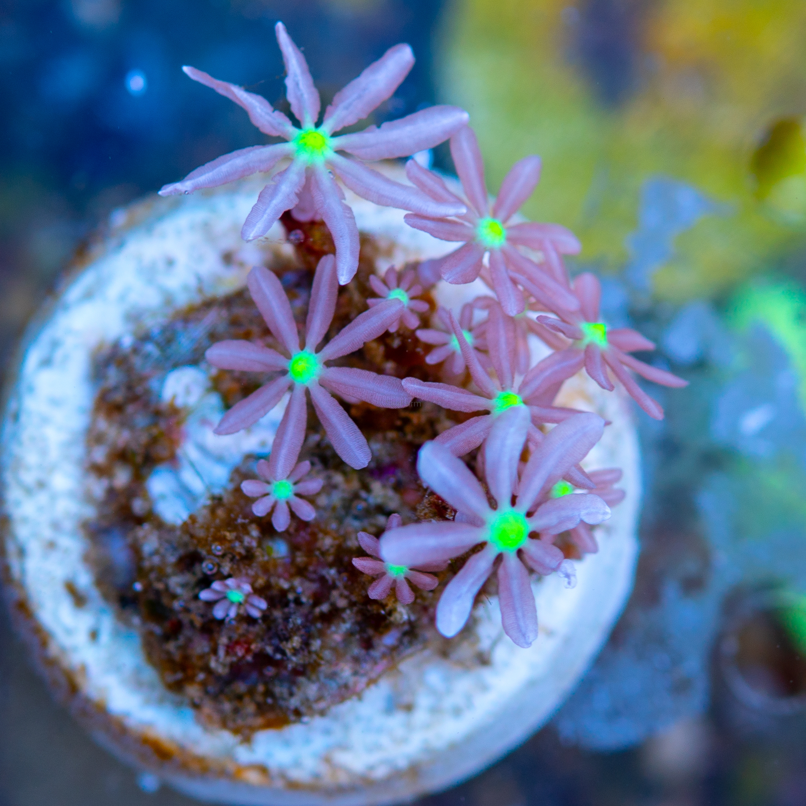 Knopia octocontacanalis to subtelny i niezwykle urokliwy koralowiec miękki, który często bywa mylony z koralowcami typu Clavularia lub Jasmine Polyps. Tworzy on delikatne, gwieździste polipy o ażurowej strukturze, które gęsto porastają skałę, tworząc efekt żywego, falującego dywanu. Jest to idealny wybór dla akwarystów szukających koralowców o drobnej, detalicznej budowie.